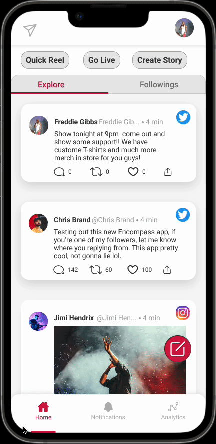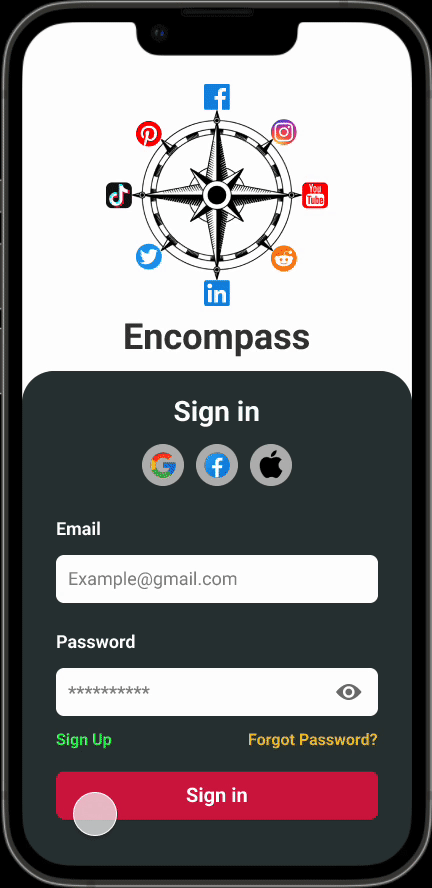 Encompass is an application that houses multiple social media platforms into one experience. Users are able to engage with their respective communities, followers, and newsfeeds interchangeably within the app. Other features include quantifying the metrics of interactions, followers, and user engagement.