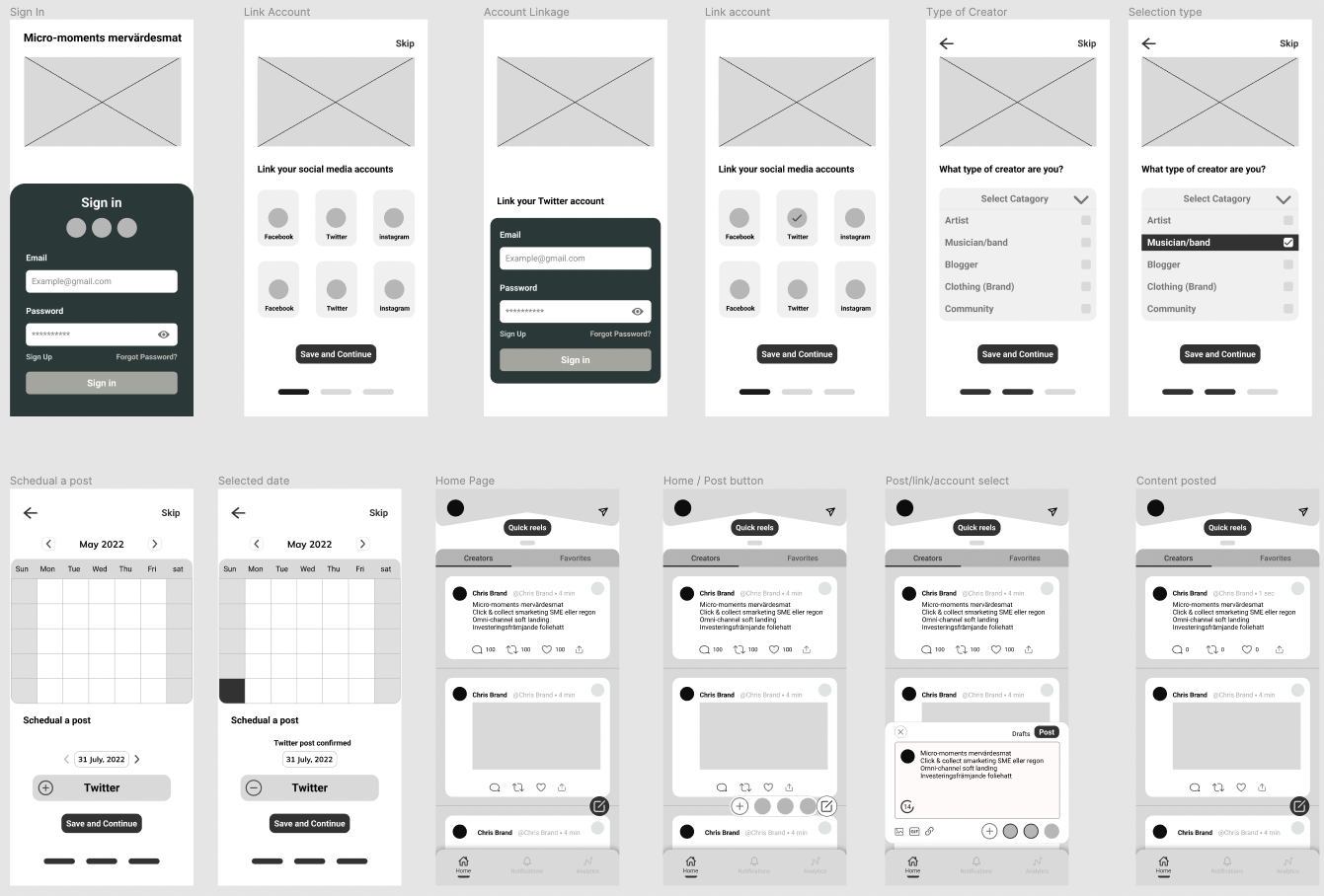 User Flow: By conducting a user flow, I was able to make an ideal flow for users to navigate an application with straight forward purposes. The flow consist of a starting point, but then breaksdown to an avid user flow for users that just enjoy engaging with their feed.Then the user flow breaks down to a flow for content creators that are trying to post to multiple applications and grow their engagment in one shot.